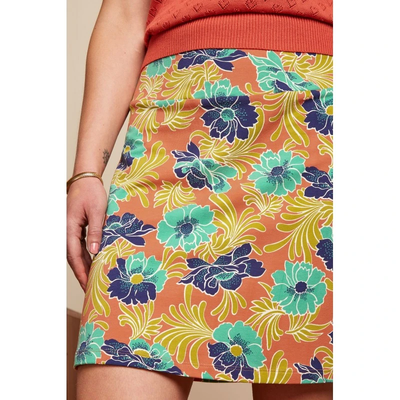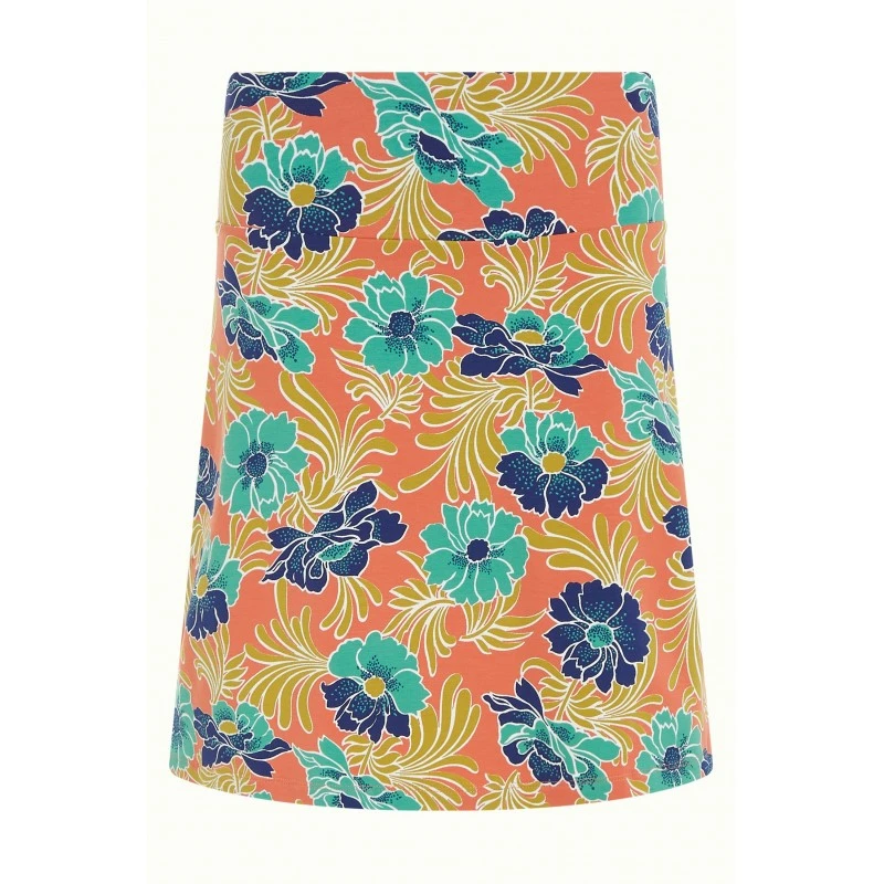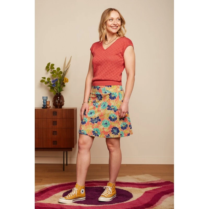 Description : jupe évasée, un large bandeau élastiqué à la taille. Longueur : au-dessus du genou