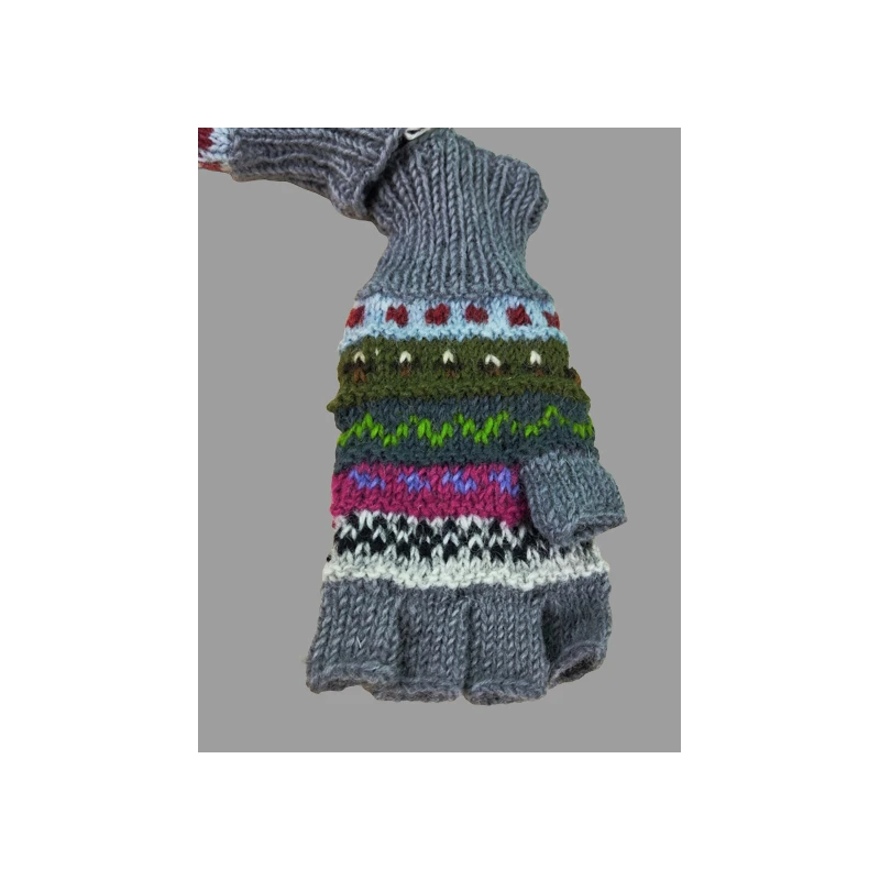 Description : mitaines multicolores, motifs variés, en tricot de laine cÎtelé aux poignets, pouce séparé