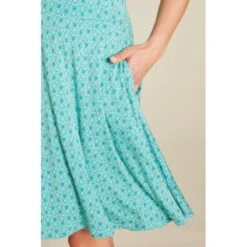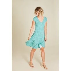 Description : col en V, forme Trapèze, découpé au dos, tombé élégant, des plis sur la jupe légèrement évasée, une ceinture et couture de séparation à la taille.