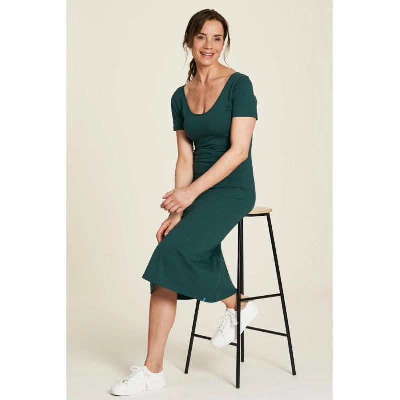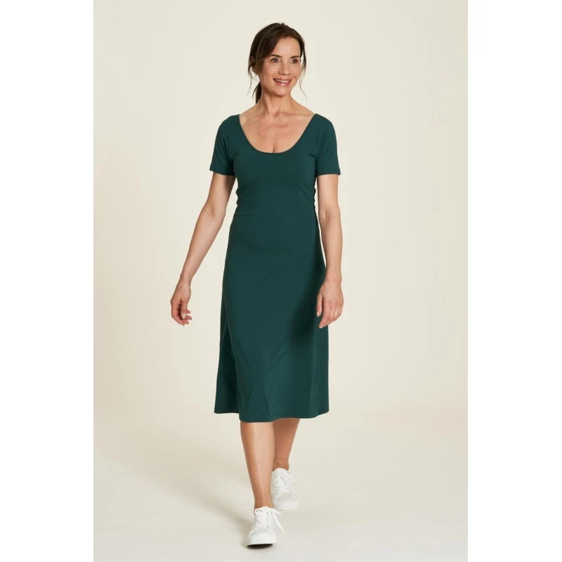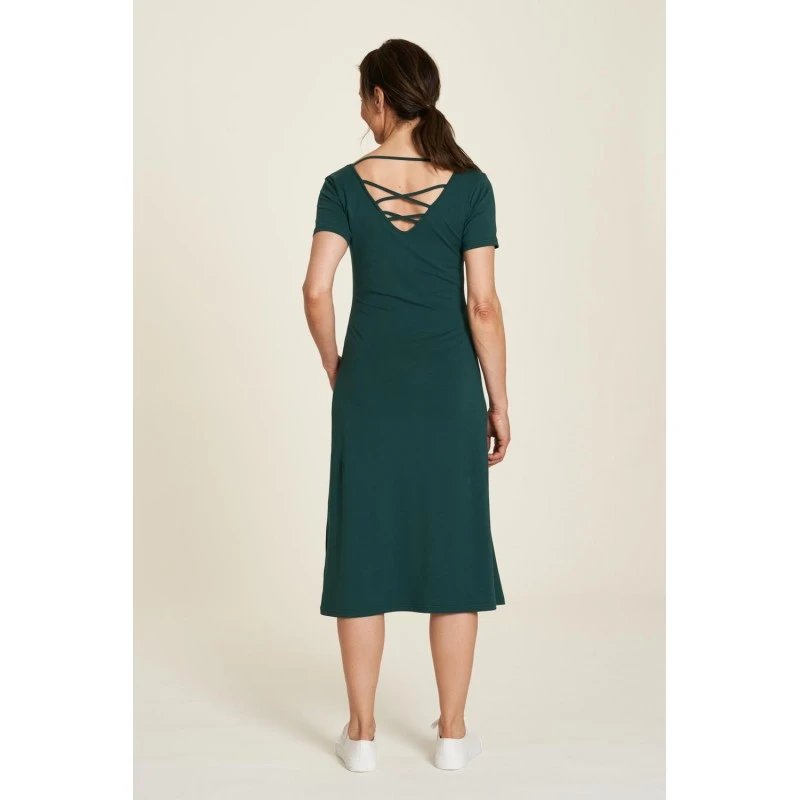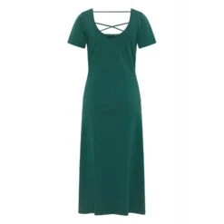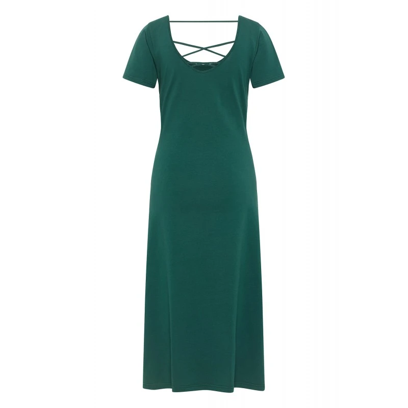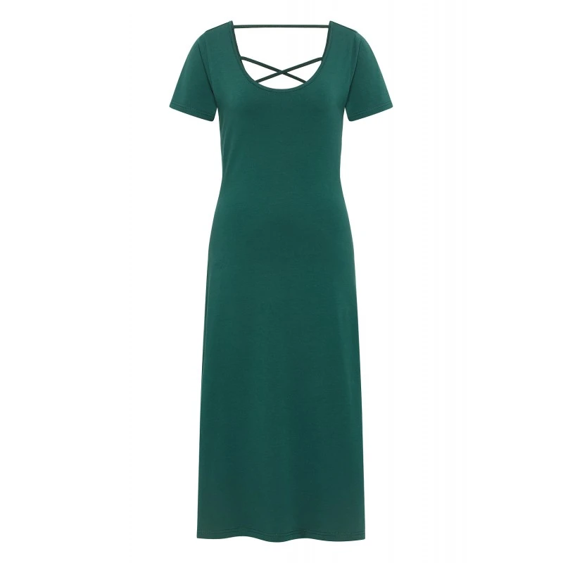 Description : robe Trapèze, col en V devant, détails croisés au dos, coupe droite, tombé fluide, manches courtes, longueur : midi moderne.