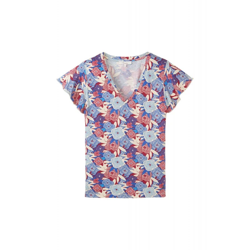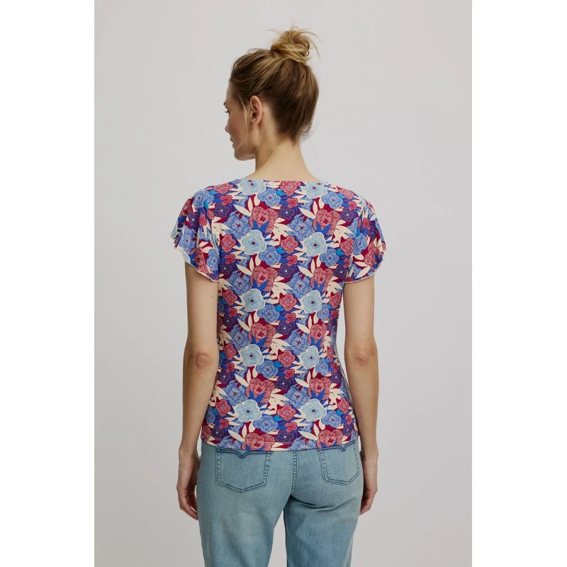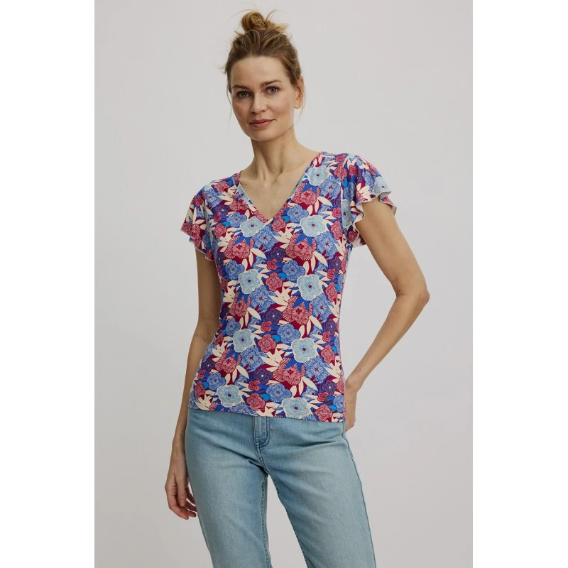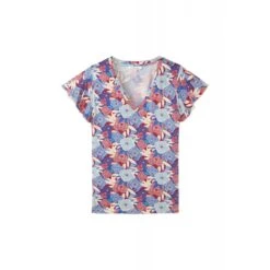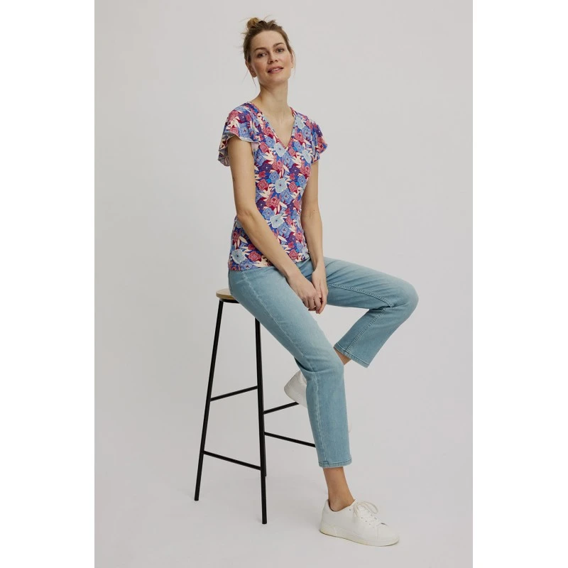 Description : coupe ajustée, manches courtes à volants légers, col en V, tissu soyeux et fin extensible.